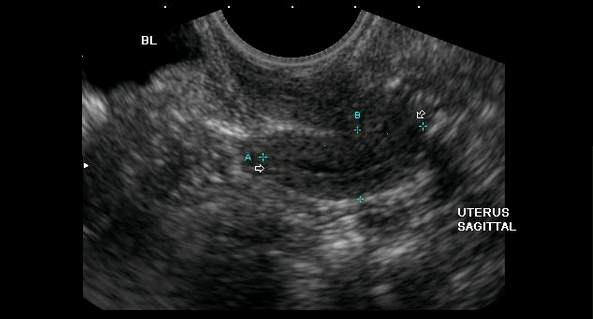 ARDMS Exam Review Questions: Quiz 1040 Sonographic findings of the endometrium in a patient with a history of pelvic inflammatory disease, fever, and elevated white blood cell count would include all of the following except: a. Ring-down artifact posterior to the endometrium b. Thin, hyperechoic endometrium c. Endometrial fluid d. Thickened, irregular endometrium Δ